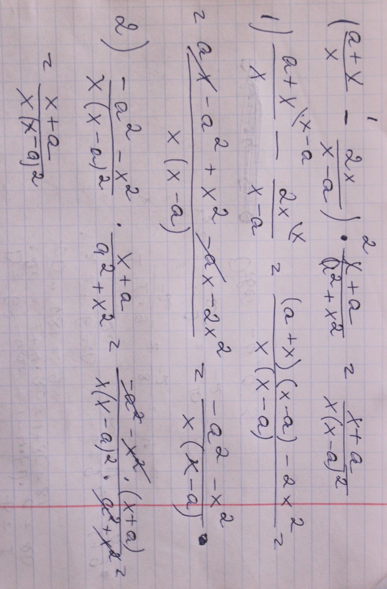 Упростить выражение. (а+х) в числителе , х в знаменателе, минус, 2х в числителе, х-а в знаменателе все это в скобках и умножить на в числителе х-а, в знаменателе а^2+x^2. спасибо
