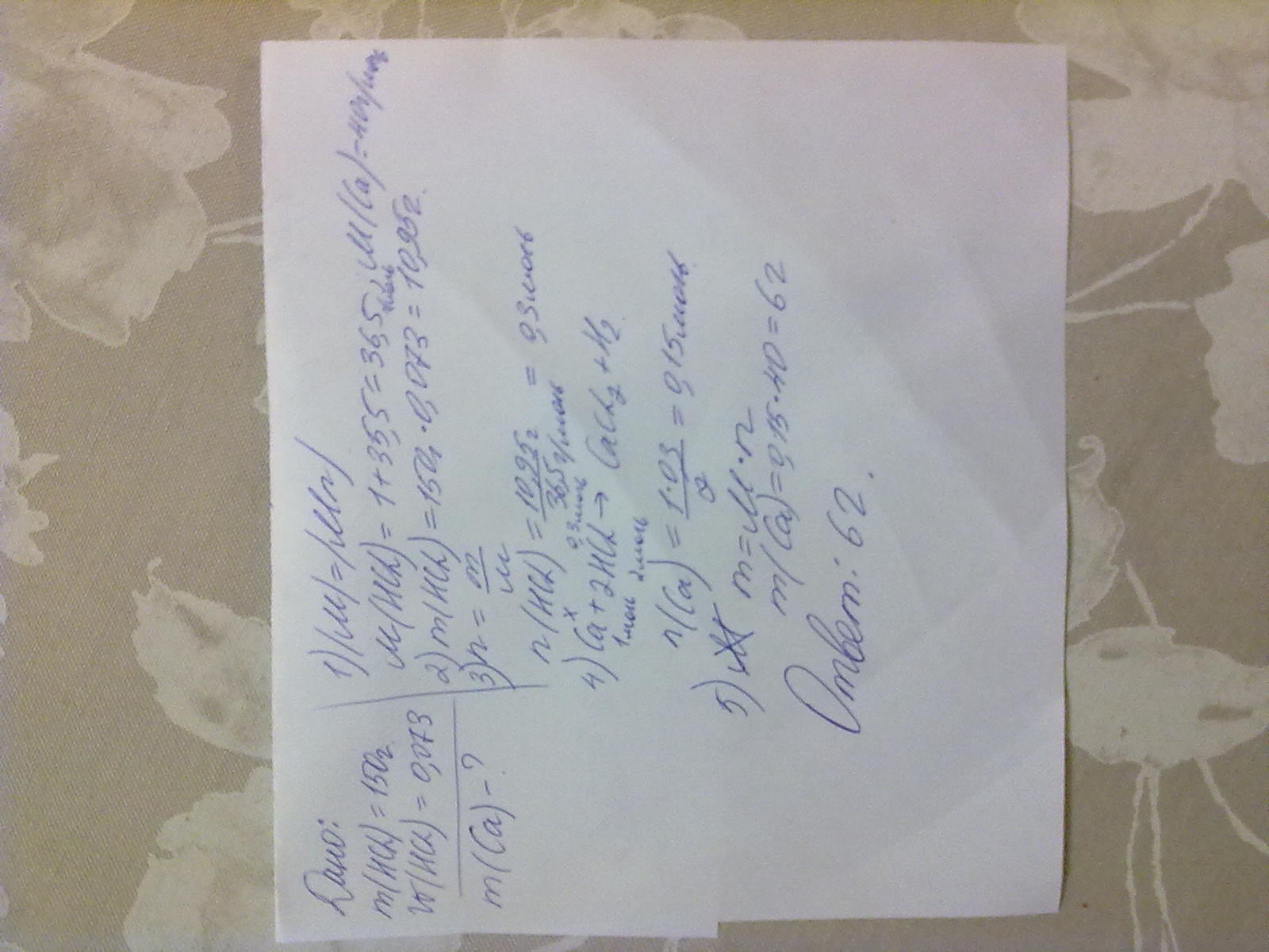 Задача 1. Раасчитайте,какая масса кальция прореагирует с раствором соляной кислоты массой 150 г,содержащим 0,073 массовой долей HCl?