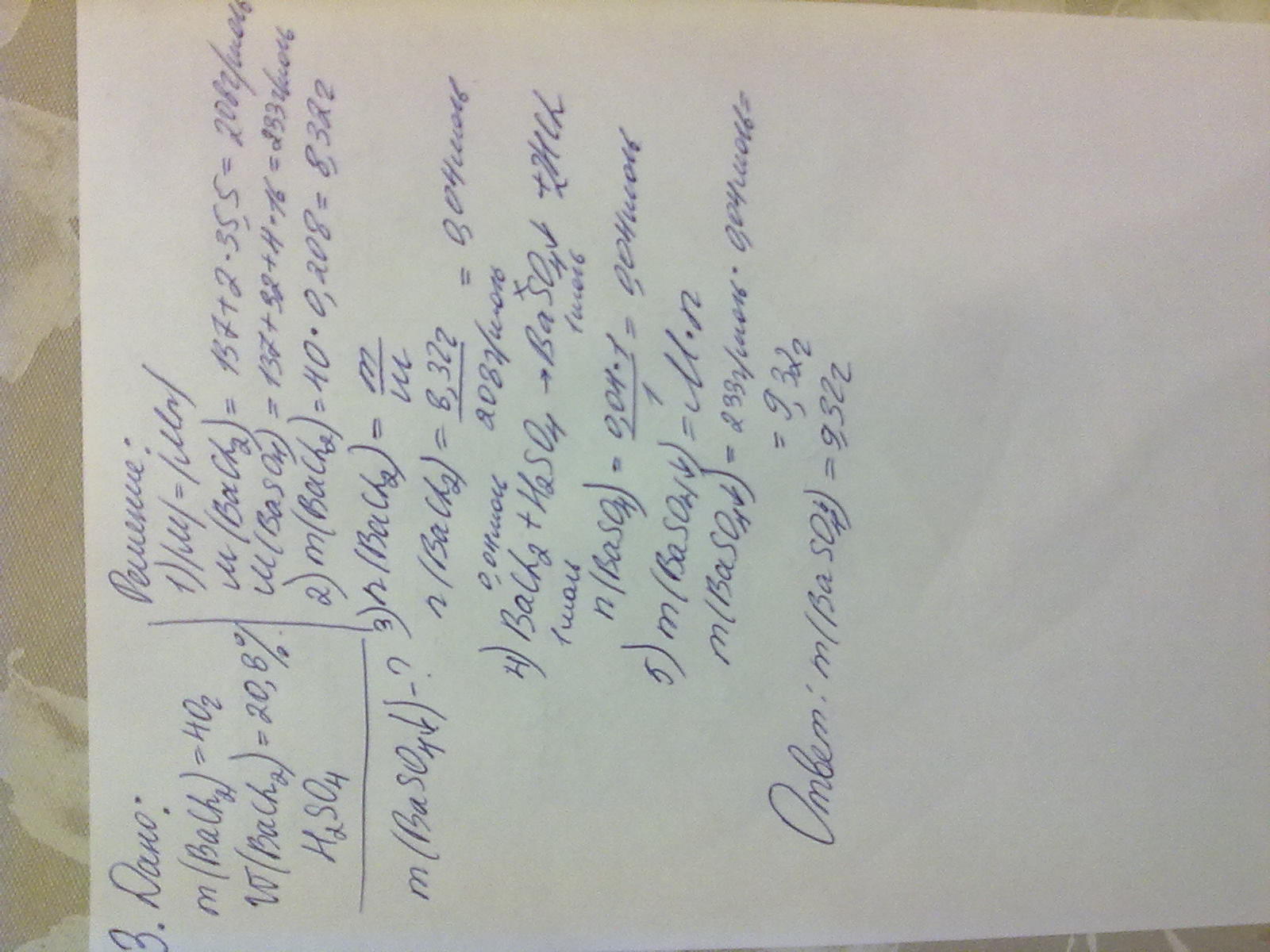 Задача 3. Определите,какая масса сульфата бария выпадает в осадок,если к 20.8%-ному раствору хлорида бария массой 40 г добавить достаточное количество серной кислоты?