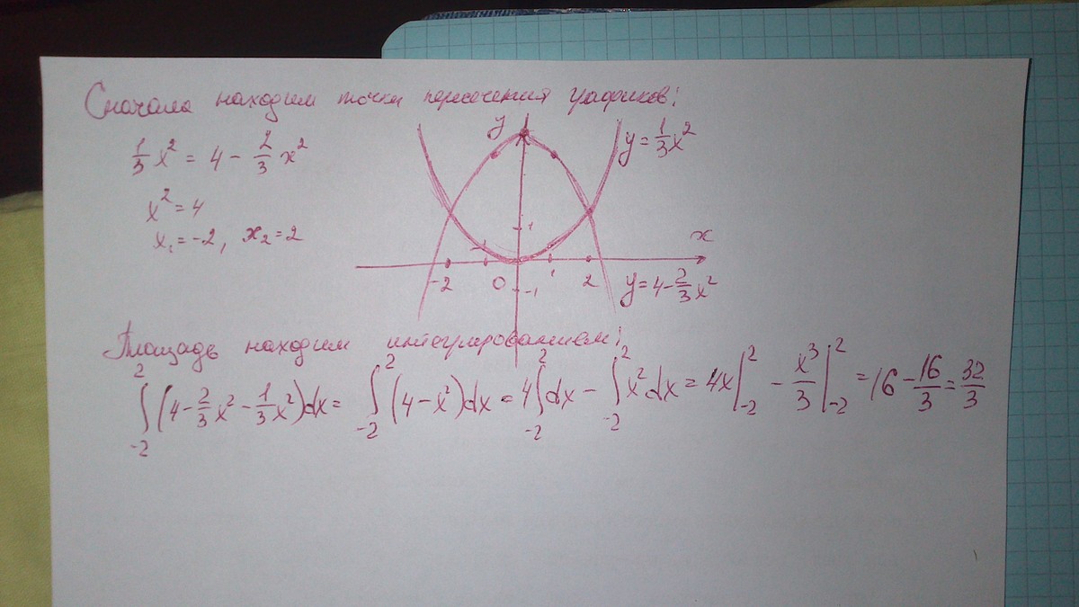 Помогите пожалуйста. Найти площадь фигуры, ограниченной заданными линиями. Сделать рисунок. y=(1/3)x^2, y=4-(2/3)x^2