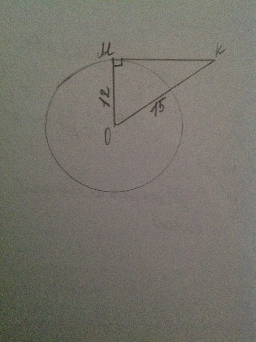 К окружности с центром О и радиусом 12см проведена касательная МК (М-точка касания). Найдите длину отрезков МК,если ОК = 15 см.