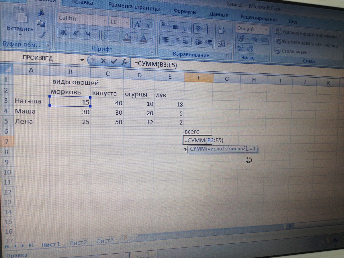 Помогите пожалуйста, нужно посчитать общую массу овощей в excel. Я вроде правильно считаю диапазон, а мне все равно выдает #ИМЯ?