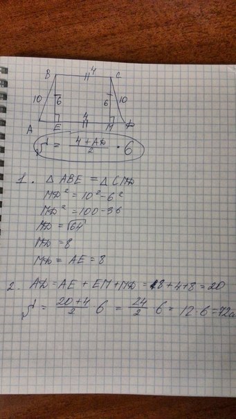В равнобедренной трапеции АВСД длина боковой стороны равна 10см,меньшее основание 4 см,а высоты 6 см,найдите площадь трапеции