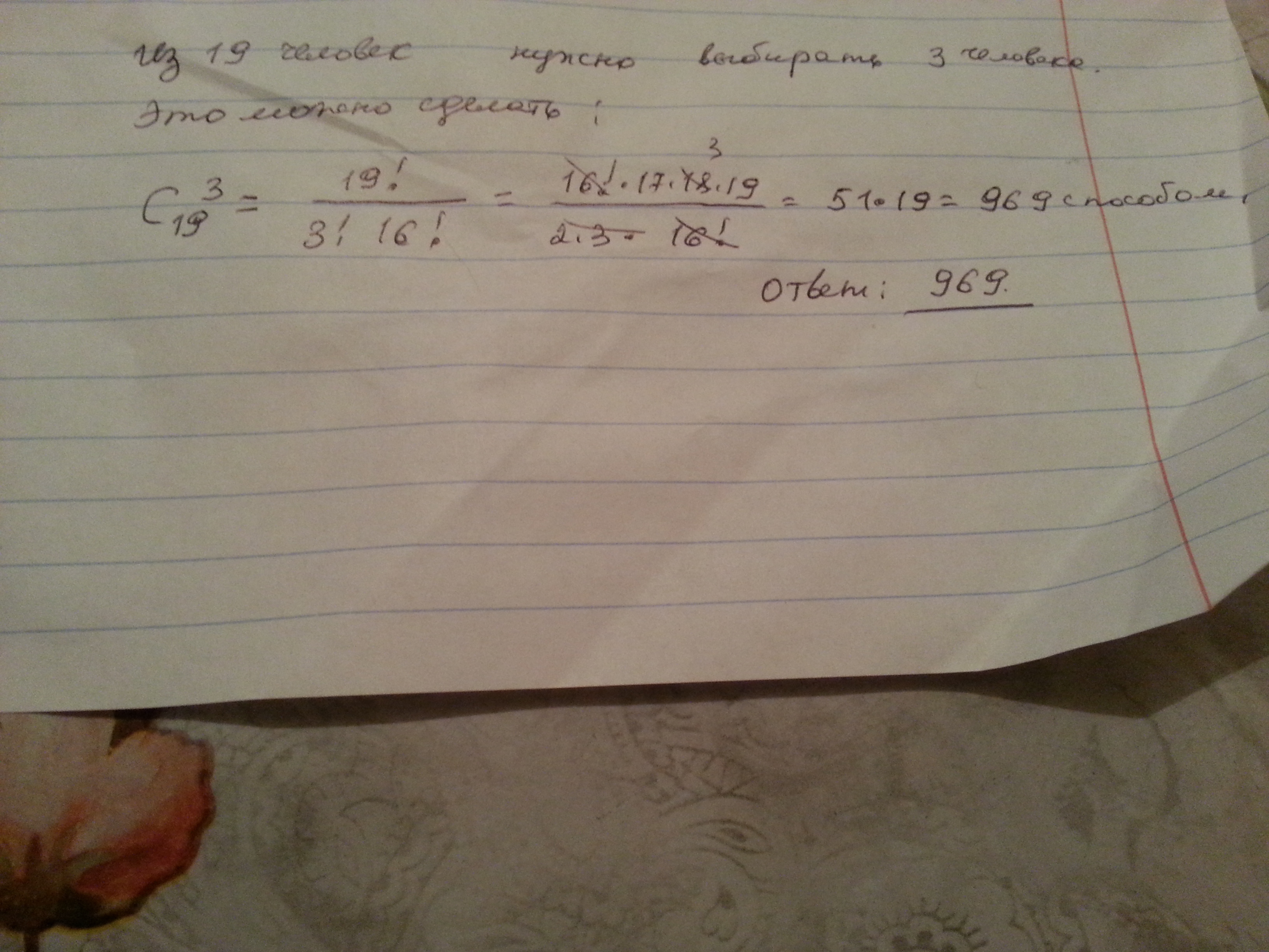 Из 19 членов бригады,прибывшим на ремонт школы,надо выделить троих для ремонта кабинета.Сколькими способами это можно сделать? Помогите мне пожалуйста решить))