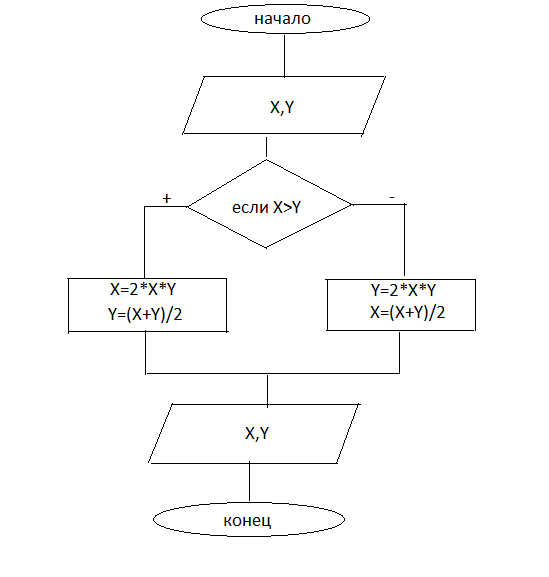 Даны действительные числа x, y (x не равно y). Меньшее из этих двух чисел заменить их полусуммой, а большее — их удвоенным произведением.