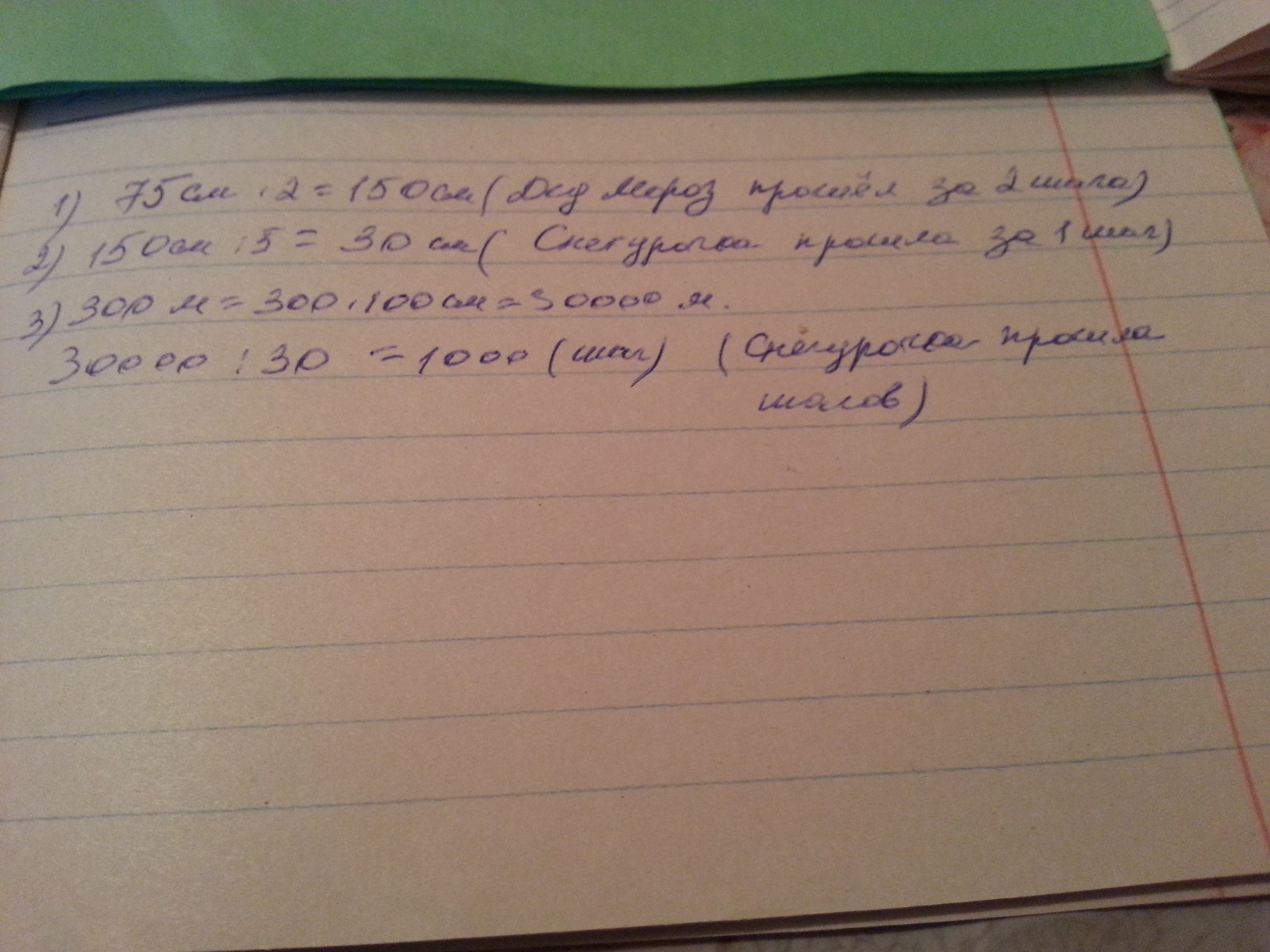 снегурочка с дедом морозом спешат на новогодний праздник.пока дед мороз делает два шага по 75см каждый,снегурочка делает 5 шагов.сколько шагов сделала снегурочка ,если дед мороз прошёл 300метров