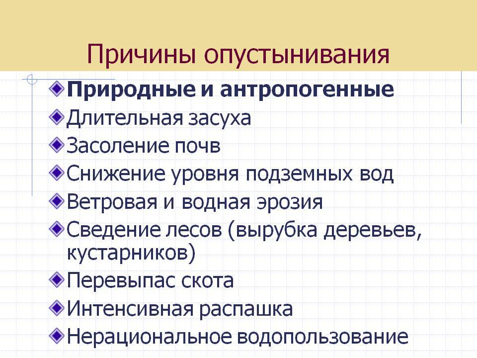Меры по борьбе с опустыниванием: 1. Прекратить распашку земель в районах, подвергающихся опустыниванию; 2. Вести рациональное животноводство; 3. Сеять травы и сажать леса.