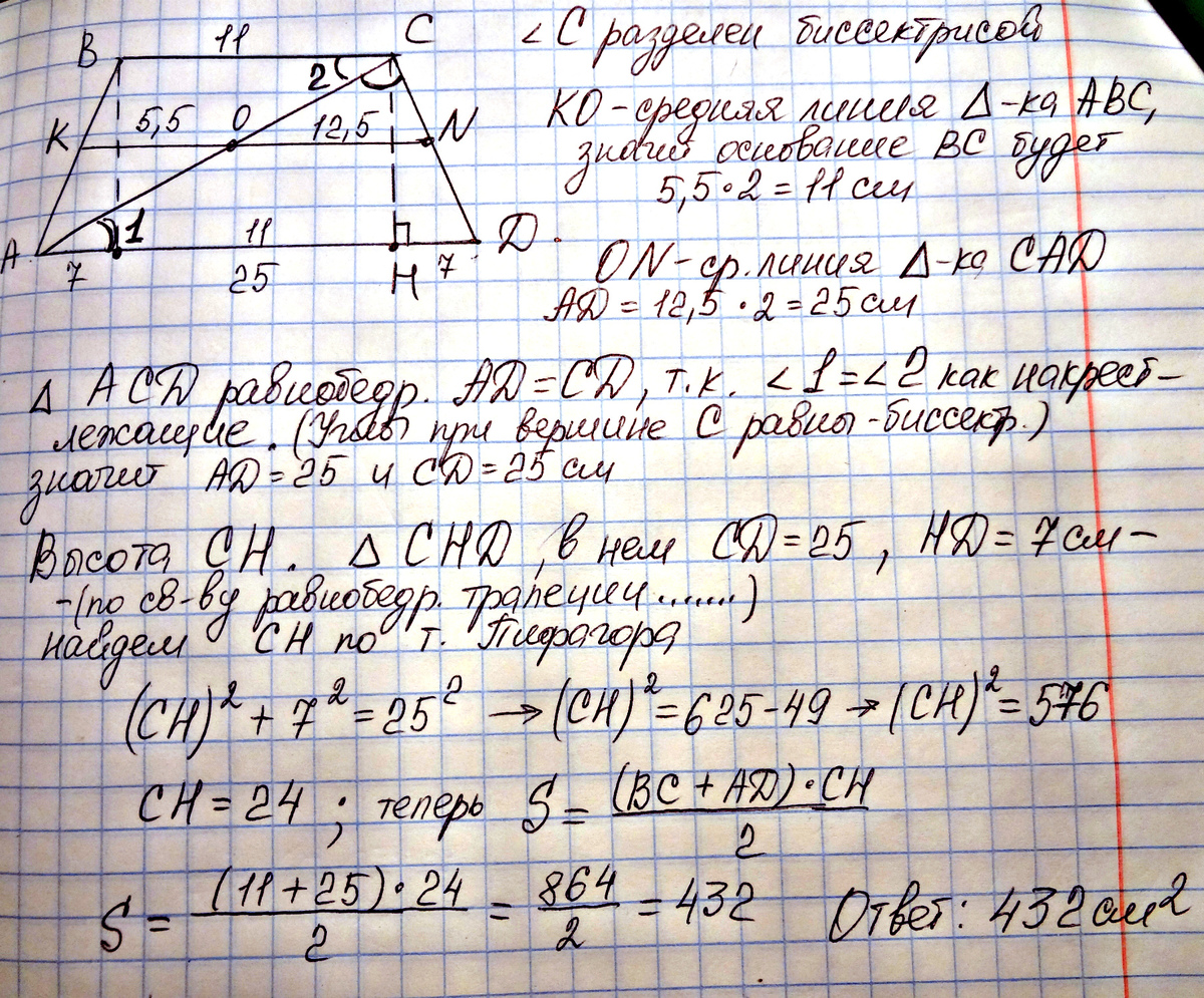 В равнобедренной трапеции диагональ является биссектрисой тупого угла и делит среднюю линию на отрезки длиной 5,5 см и 12,5 см. Найти площадь трапеции.