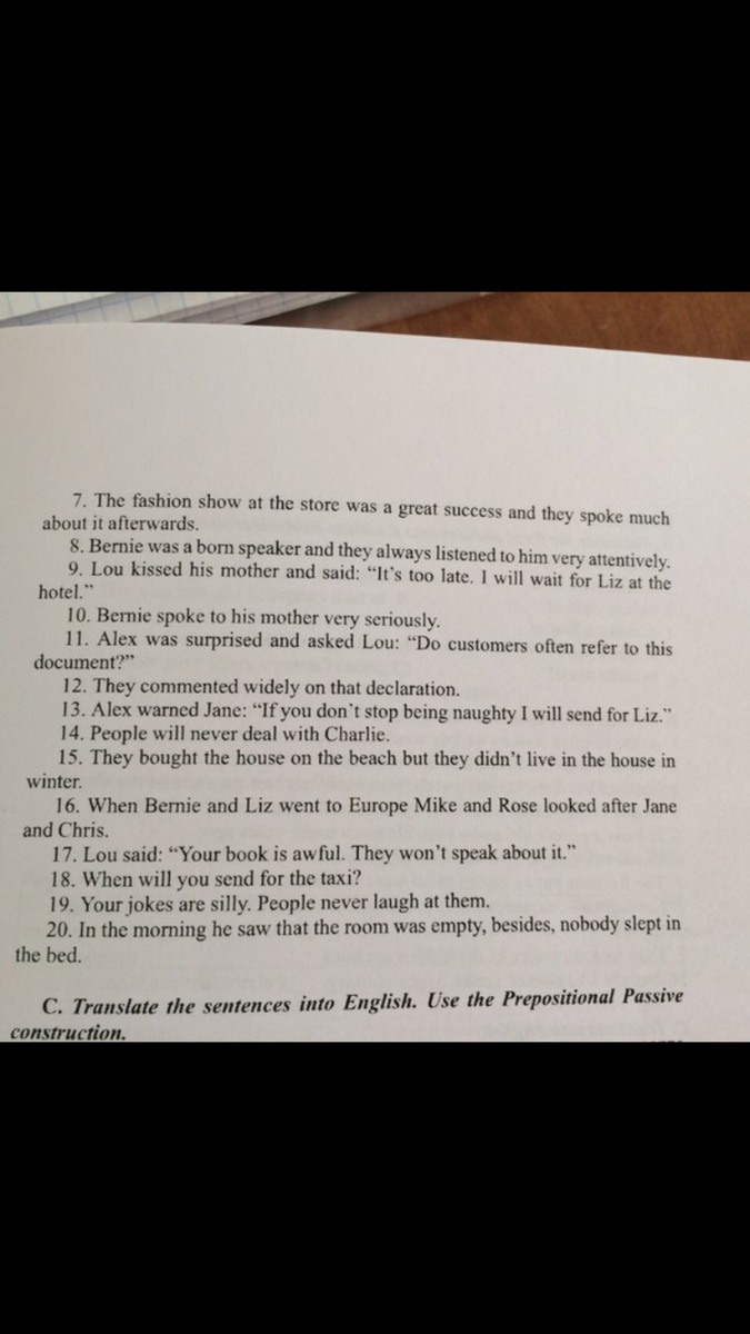 Может кто нибудь , хоть что нибудь отсюда решить ? Нужно rewrite sentences in the passive voice . Use the prepositional passive construction