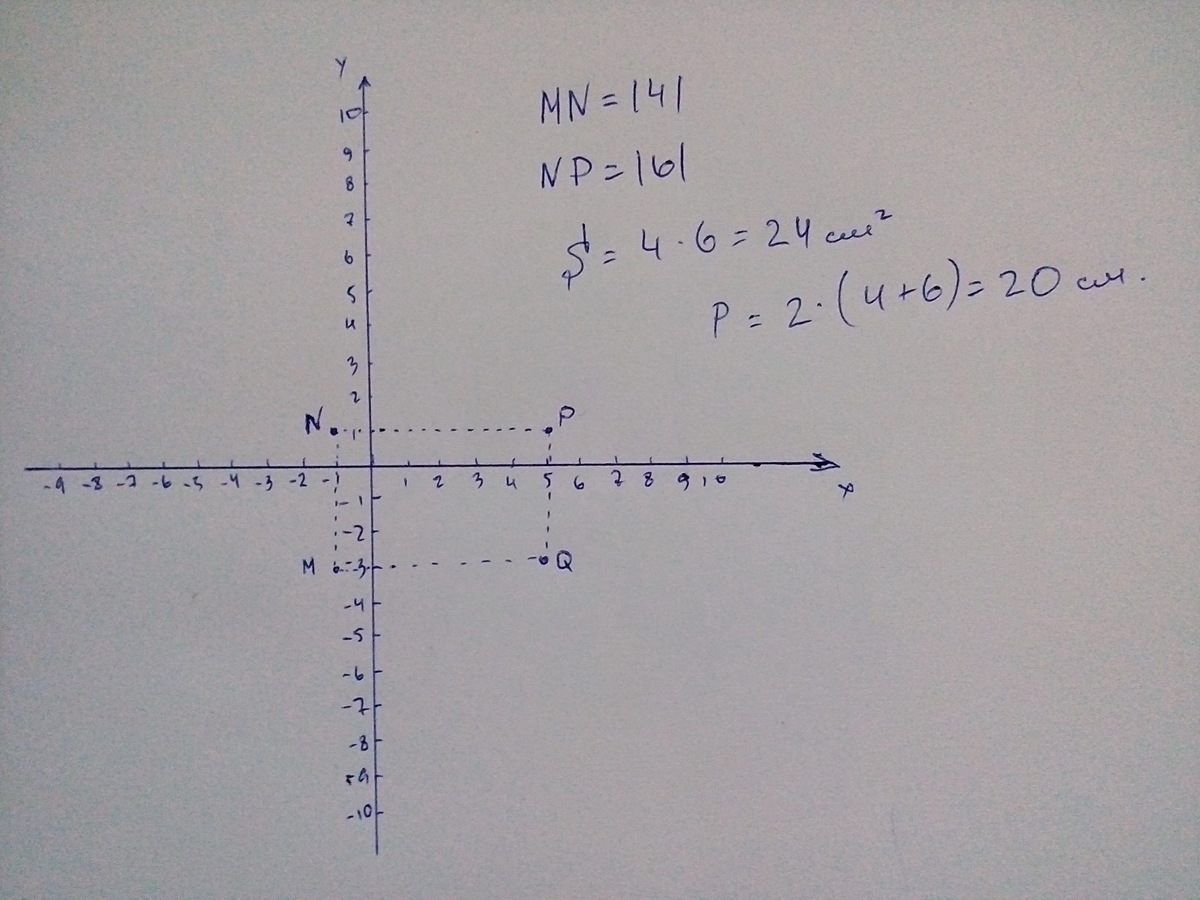 Построить на координат. плоскости прямоугольник MNPQ, стороны которого паралельны осям координат, если М(-1;-3), Р(5;1). Найдите периметр и площадь, если единичный отрезок равен 1см.