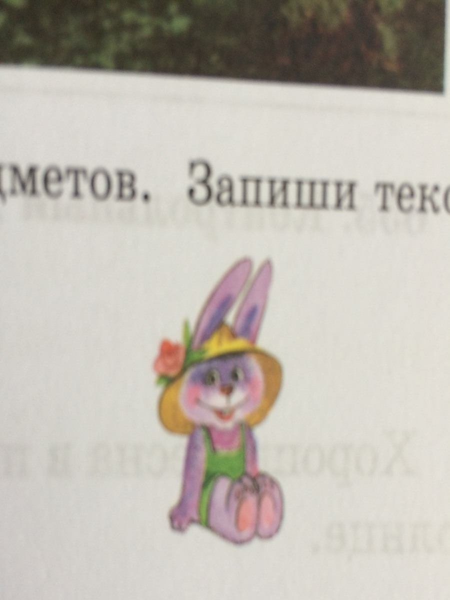 Фиолетовый зайка в зеленом платье. У него желтая шляпка с цветочком. Зайка мило улыбается. Щечки зайки ярко-розового цвета. Глаза у него зеленые.Носик красный.