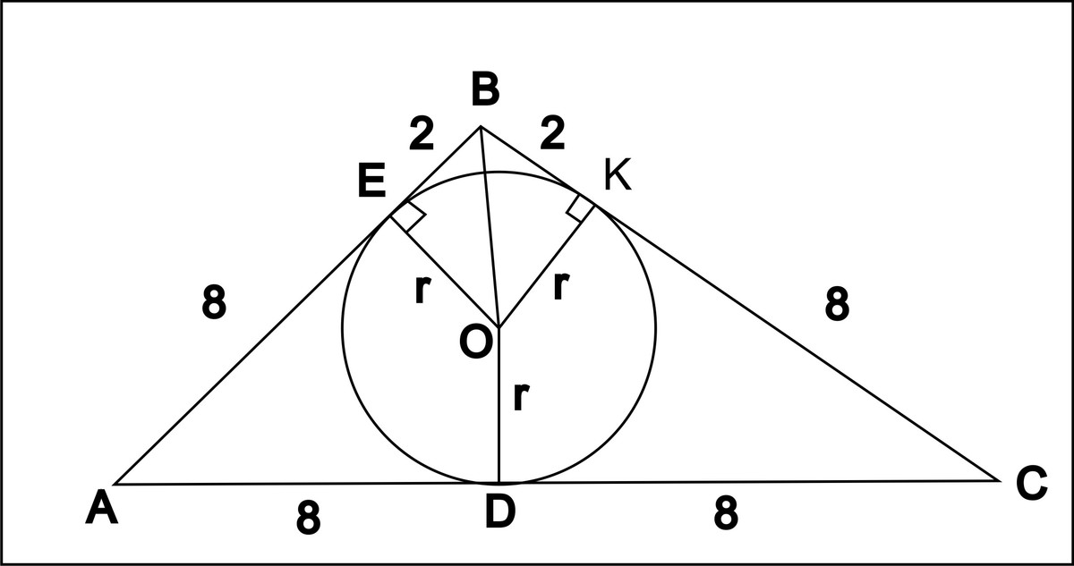 C с основанием A C вписона окружность.Она касается стороны B C в точке K.Найдите радиус окружности, если B K =2, C K=8.