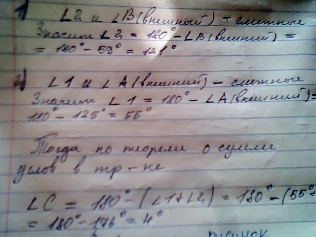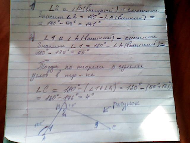 В треугольнике ABC внешний угол при вершине А равен 125 градусов, а внешний угол при вершине В равен 59 градусов Найдите угол С