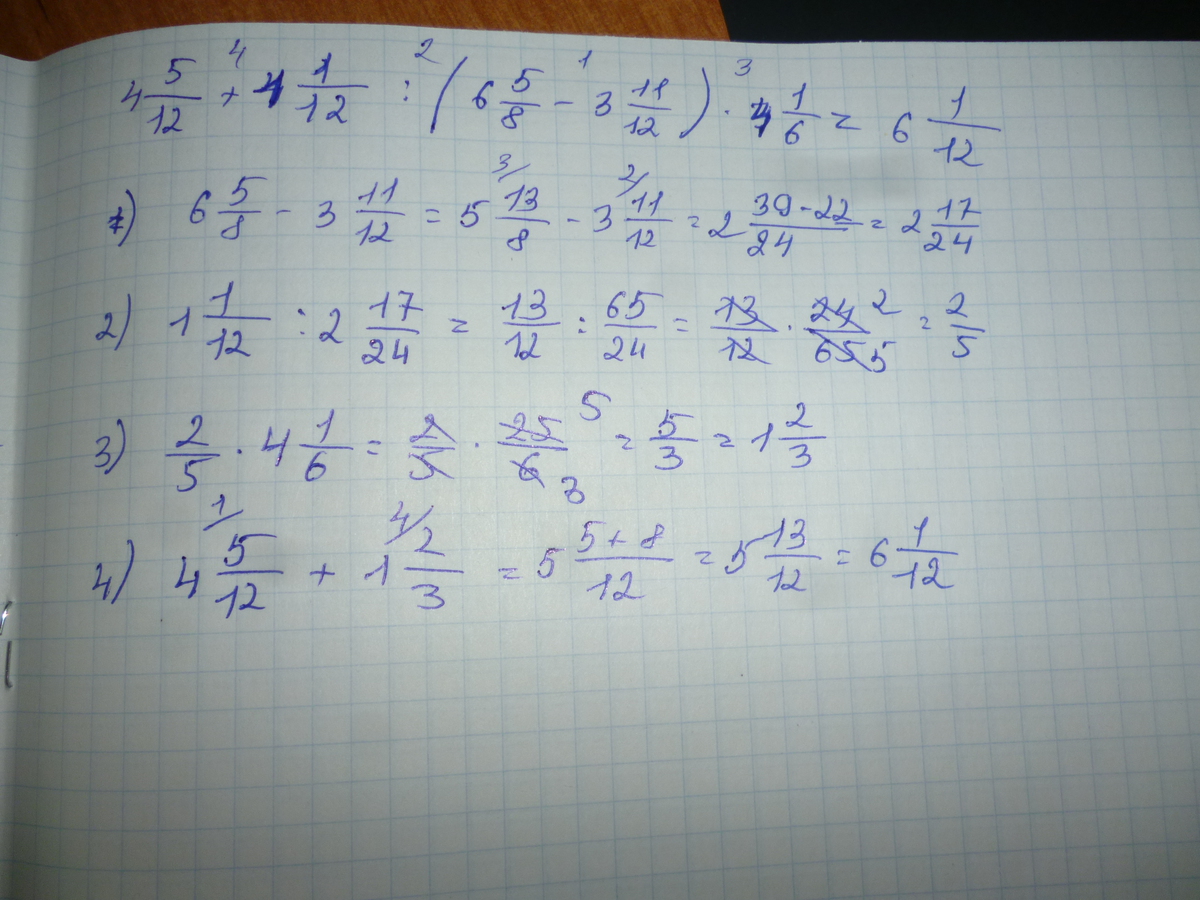 4целых5/12+1целая1/12:(6 целых5/8 - 3целых 11/12) *4целых 1/6
