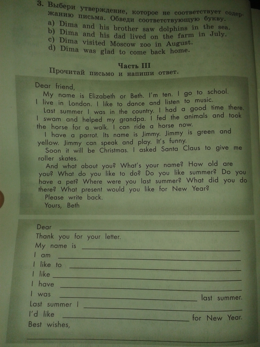 Меня зовут Элизабет или Бет. Мне десять. Я хожу в школу. Я живу в Лондоне. Мне нравится танцевать и слушать музыку.