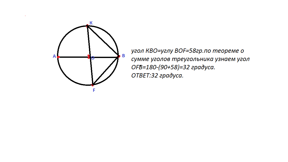На окружности по разнее стороны от диаметра АВ взяты точки К и F. Известно,что угол КВА=58градусов.Найти угол КFВ.