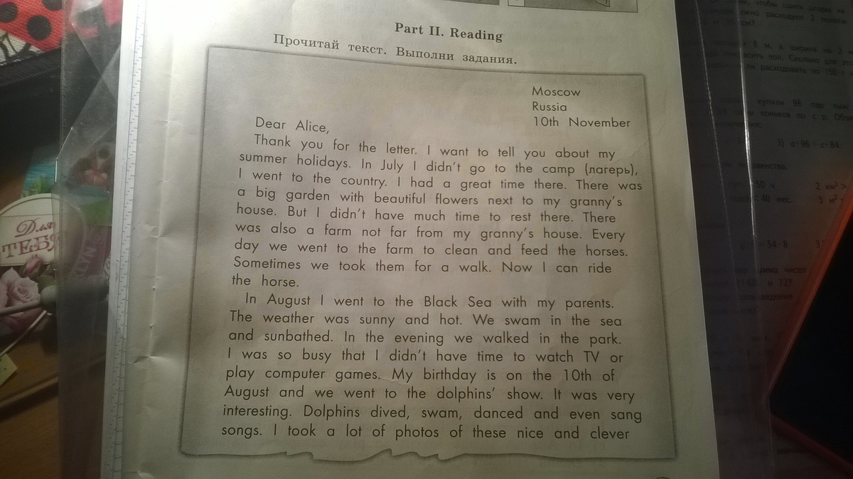 в августе я поехала в чёрное море с родителями. погода была солнечная и жаркая. мы плавали на море и загорали. вечером мы гуляли в парке. я был так занят, что у меня не было времени смотреть телевизор или играть компьютерные игры. моё др 10 августа и мы пошли в шоу дельфинов. это было очень интересно.дельфины ныряли, плавали, танцевали и даже пели песни. я снял много фото этих прекрасных и умных ....