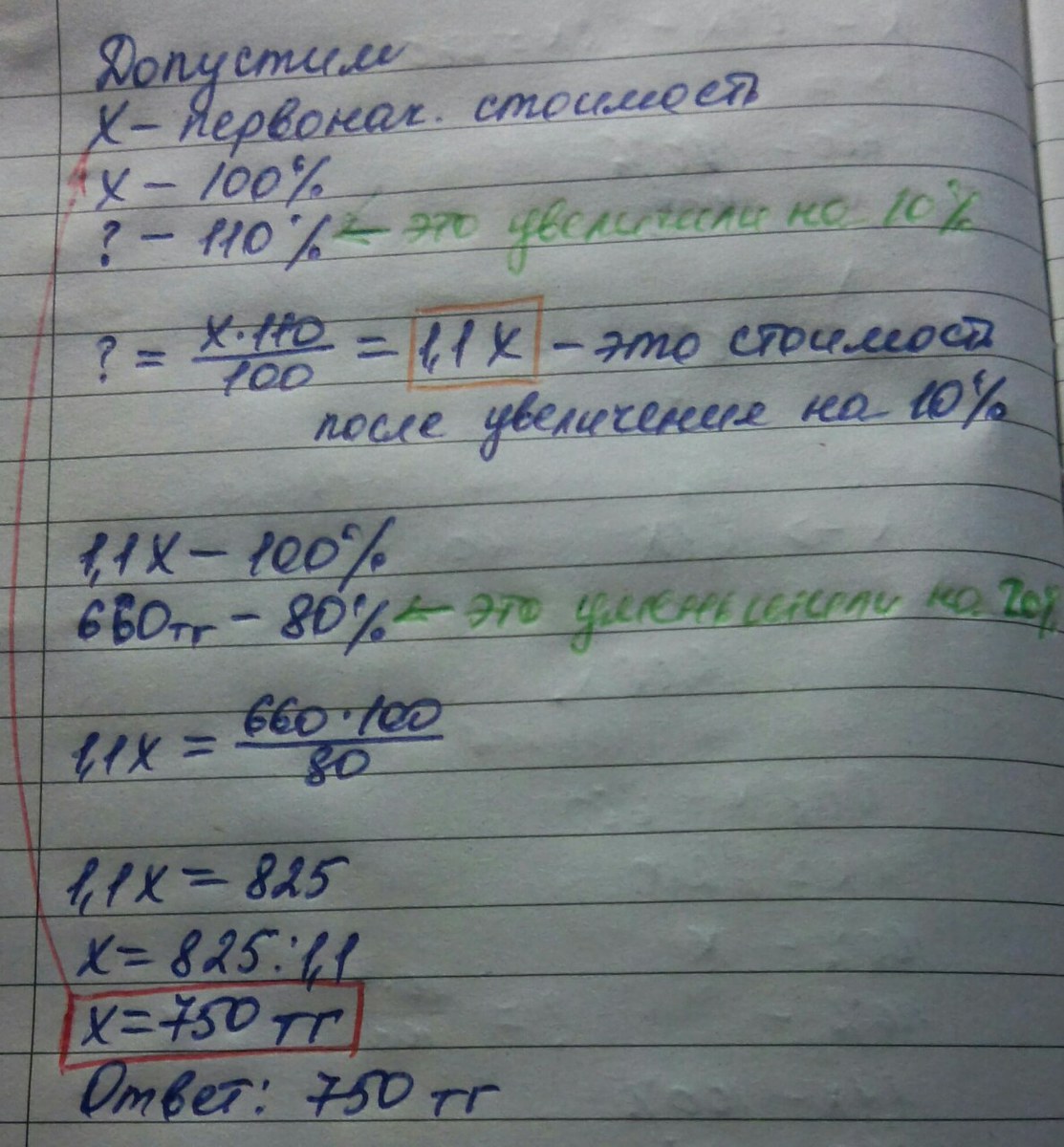 Цена товара повысилась на 10%, затем понизилась на 20% и стала стоить 660 тг. Какова первоначальная цена?