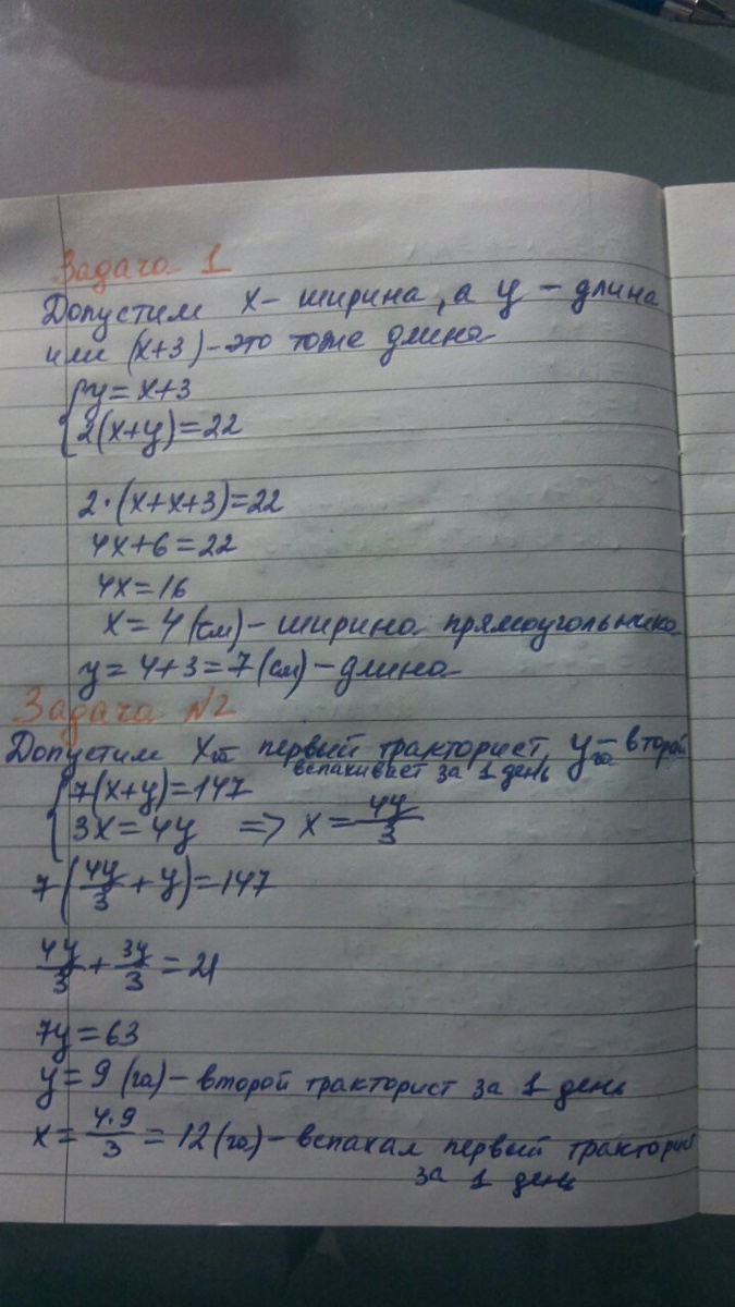 2) Два тракториста за 7 дней вспахали 147 га поля. Площадь поля, вспаханного первым трактористом за 3 дня, равна площади поля, вспаханного вторым трактористом за 4 дня. Сколько гектаров поля вспахал каждый тракторист за один день?