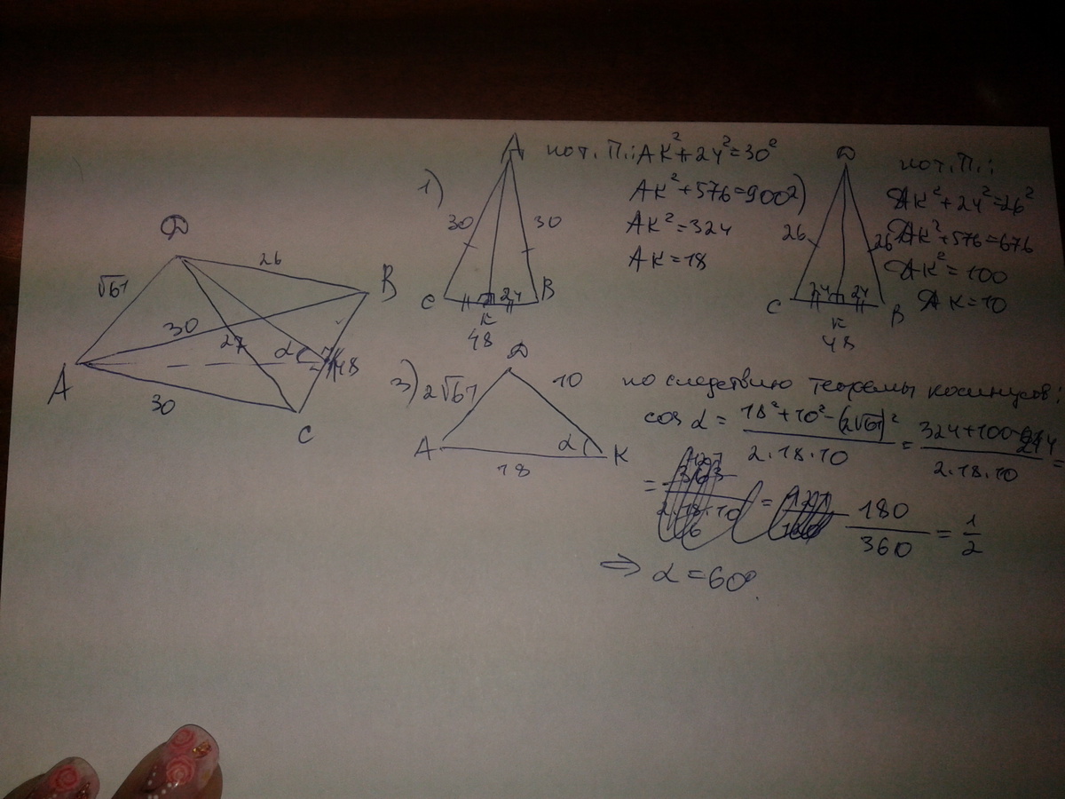 Равнобедренные треугольники ABC и DBC имеют общее основание BC. Точка D не лежит в плоскости треугольника ABC. Найдите угол между плоскостями треугольников, если BD=DC=26 дм, AB=AC=30 дм, BC=48 дм, AD=2sqrt61 дм