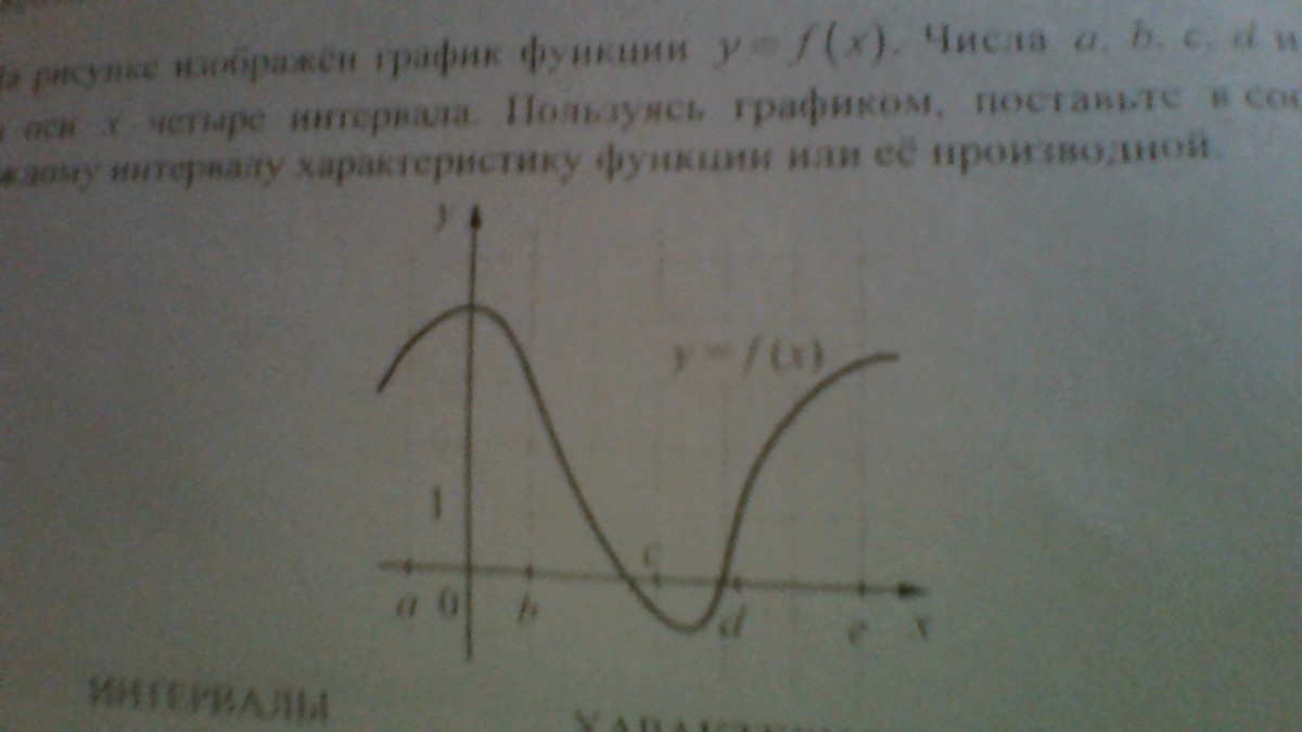 На рисунке изображён график функции y=f(x). Числа a, b , c, d, e задают на оси х четыре интервала. Пользуясь графиком, поставьте в соответствие каждому интервалу характеристику функции или её производной.