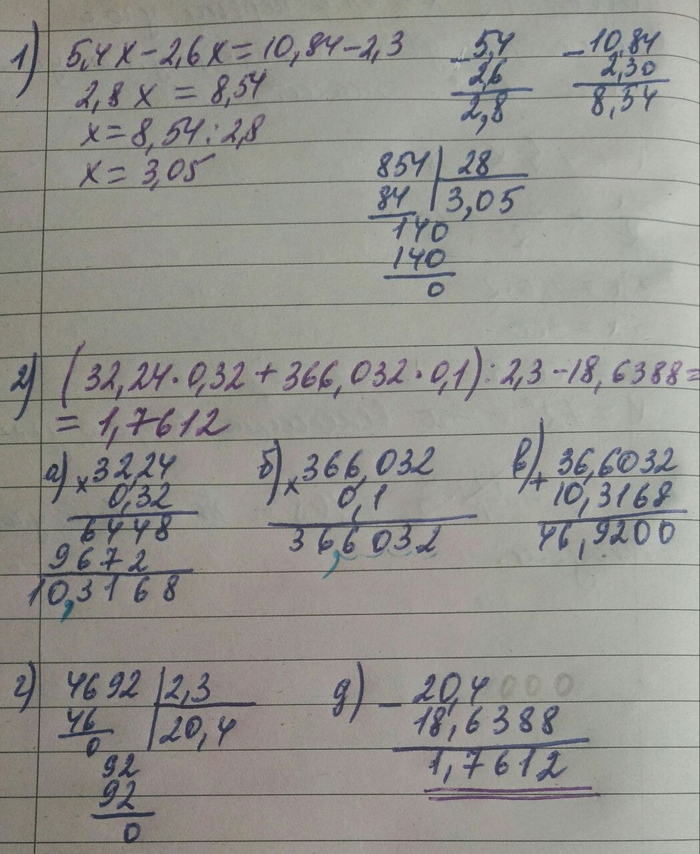 1Решите уравнение 5,4х - 2,6х = 10,84-2,3. Столбиком.