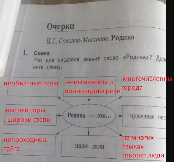 Родина!Особенно звучит для меня это слово, полное глубокого смысла. Я вижу её необъятные поля, волнующиеся урожаем. Тёплый ветер пролетает над ними, поднимая цветочную пыль. Обширна и многообразна родившая нас страна. Неиссякаемы и полноводны реки, высоки горы, блистающие вечными ледниками. Свет яркого солнца отражается в их снеговых вершинах. Широки знойные степи, непроходима глухая сибирская тайга, раскинувшаяся океаном. Многолюдны и многочисленны города, разбросанные в стране нашей. На многих языках говорят люди, населившие величественную эту страну. Просторны синие дали, звонки и чудесны песни живущего в ней народа.