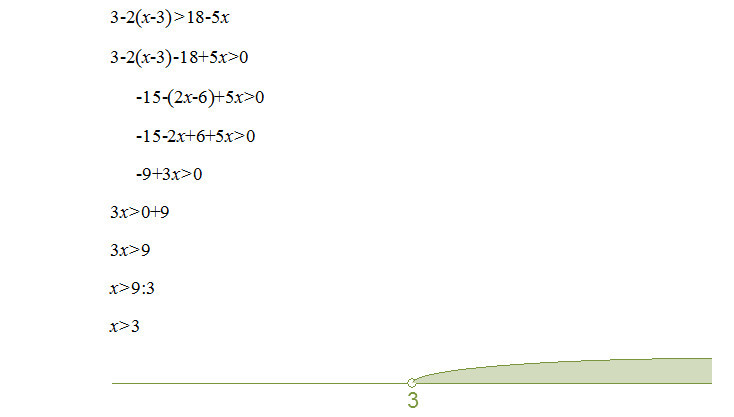 Решите неравенство 3-2(х-3)>18-5х и сделайте рисунок, на котором будет изображено множество его решений.