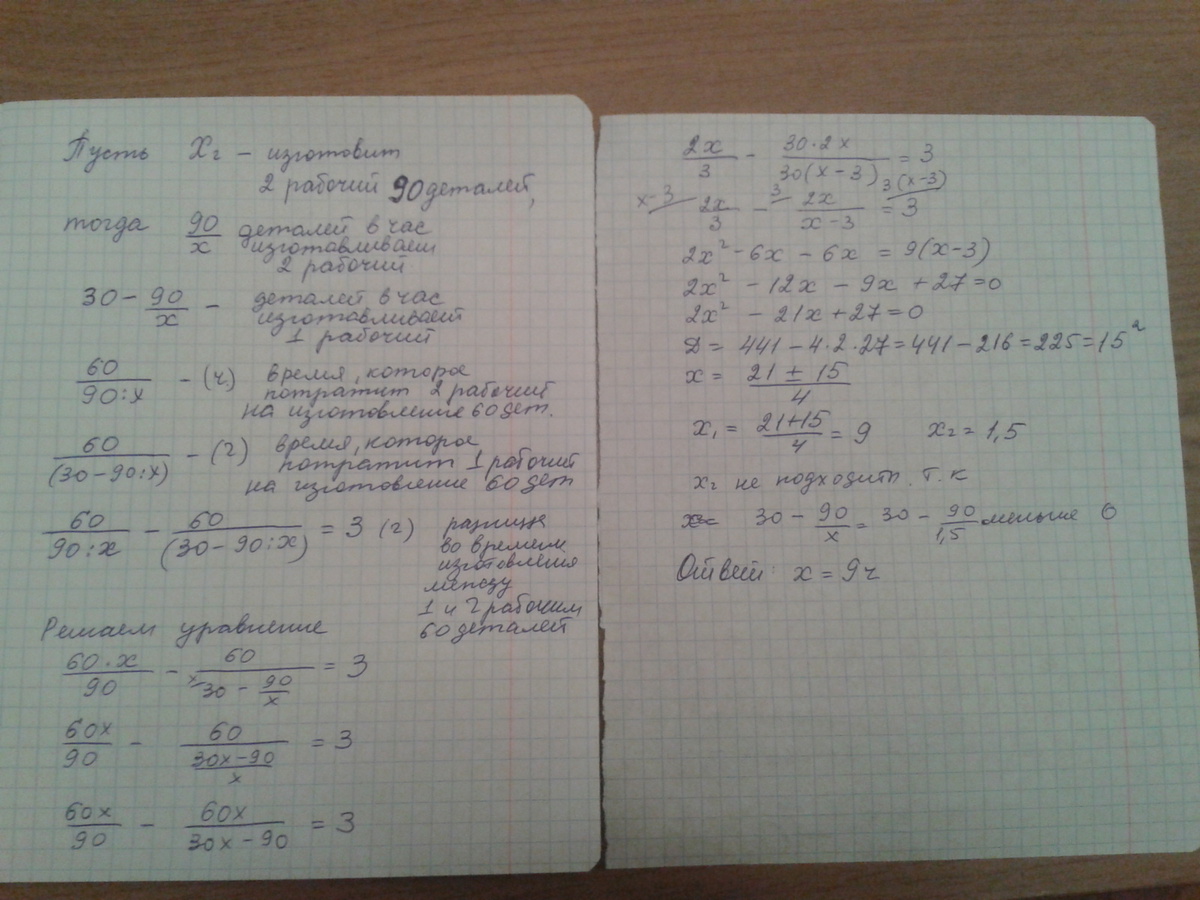 7. Первый рабочий изготовил 60 деталей на 3 часа быстрее второго. За сколько часов второй рабочий изготовит 90 деталей, если, работая вместе, они изготавливают за 1 час 30 деталей?