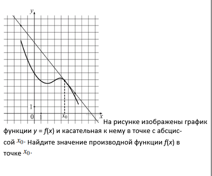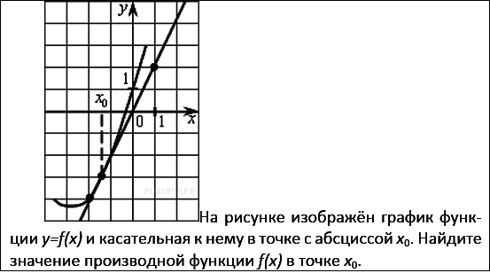 Для начала вспомним геометрический смысл производной. Мы знаем, что значение производной в точке x0 равно угловому коэффициенту касательной, проведённой в точку x0. Значит, нам по сути надо просто найти угловой коэффициент прямой k. По всё тому же геометрическому смыслу k = tg a, а - угол между прмой и положительным направлением оси абсцисс. Находим его из прямоугольного треугольника. Например, по рисунку могу соединить две чёрные жирные точки, они образуют прямоугольный треугольник с катетами 6 и 3. Тогда tg a = 6/3 = 2