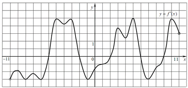 9.На рисунке изображен график у = f′(х) — производной функции f(х), определенной на интервале (–11; –11). Найдите количество целых значений х, при которых функция f(x) возрастает.