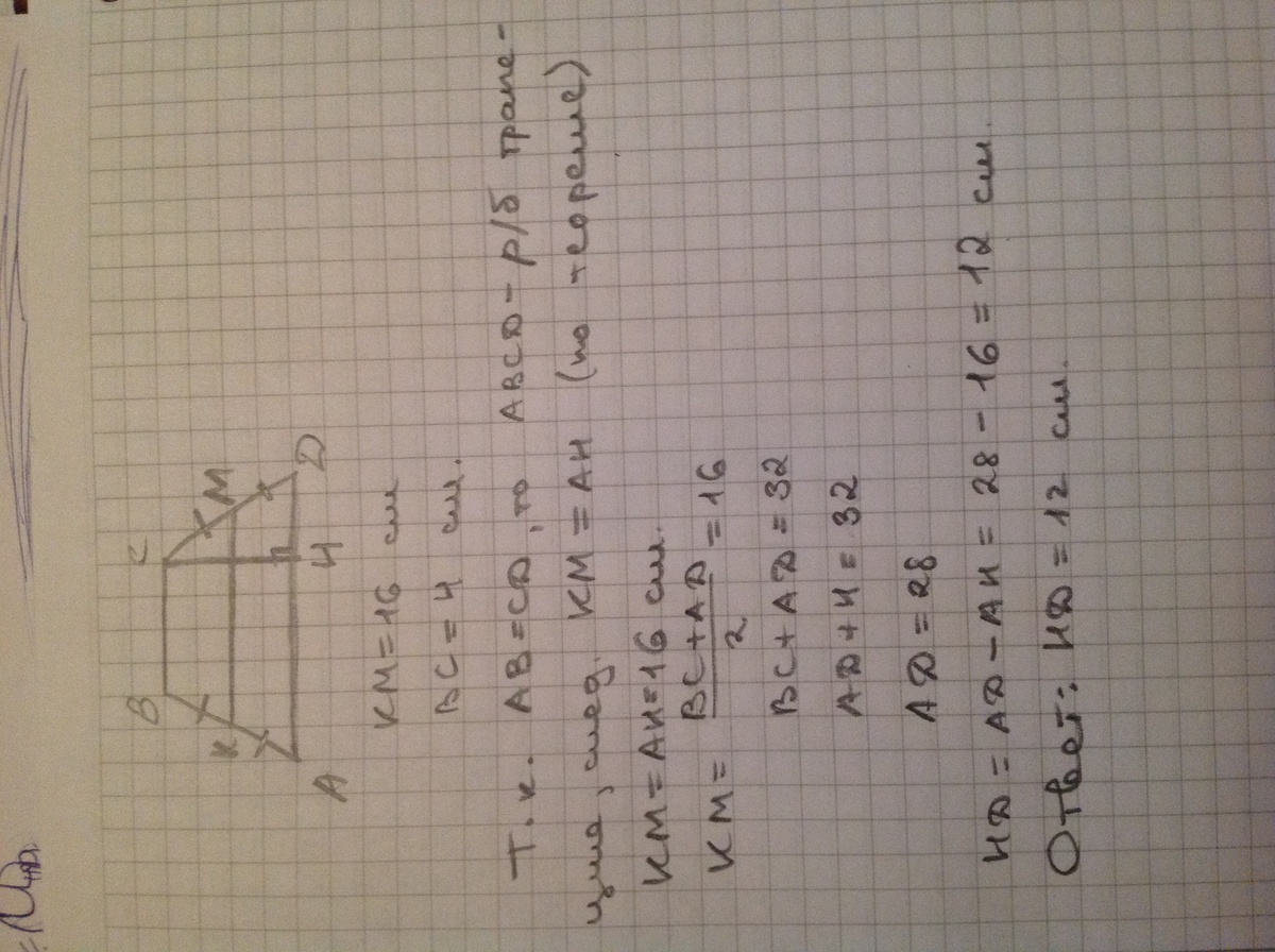В трапеции АВСD боковые стороны AB и CD равны, CH — высота, проведённая к большему основанию AD. Найдите длину отрезка HD, если средняя линия KM трапеции равна 16, а меньшее основание BC равно 4.