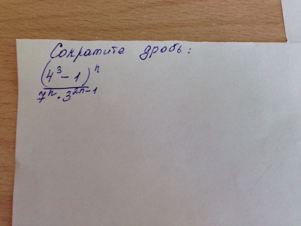 63^n / 7^n*3^2n-1 = распишем 63^n (получили так: 4^3 = 64-1 = 63^n) на множители = (7*3^2)^n / 7^n * 3^2n-1 = 7^n * 3^2n / 7^n * 3^2n-1 = у одинаковых множителей вычитаем степени (т.к. при делении степени вычитаются) 7^ n-n * 3^2n-2n-1 = 1 (т.к. число в нулевой степени равно 1) * 3^ -1= 1 * 1/3 (т.к. при минусовой степени дробь переворачивается) = 1/3