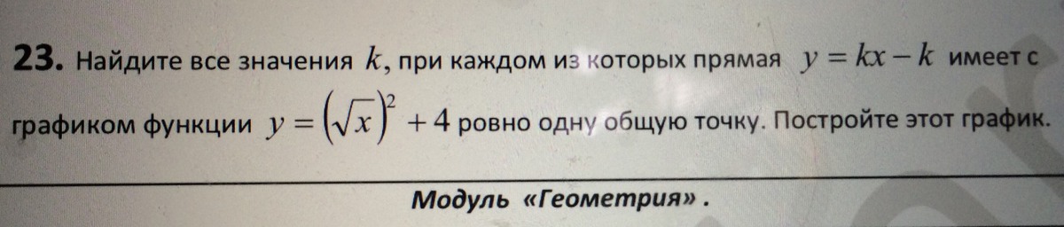найдите все значения k при каждом из которых прямая y=kx-k имеет с графиком функции y=(sqrt x)^2+4 ровно одну общую точку
