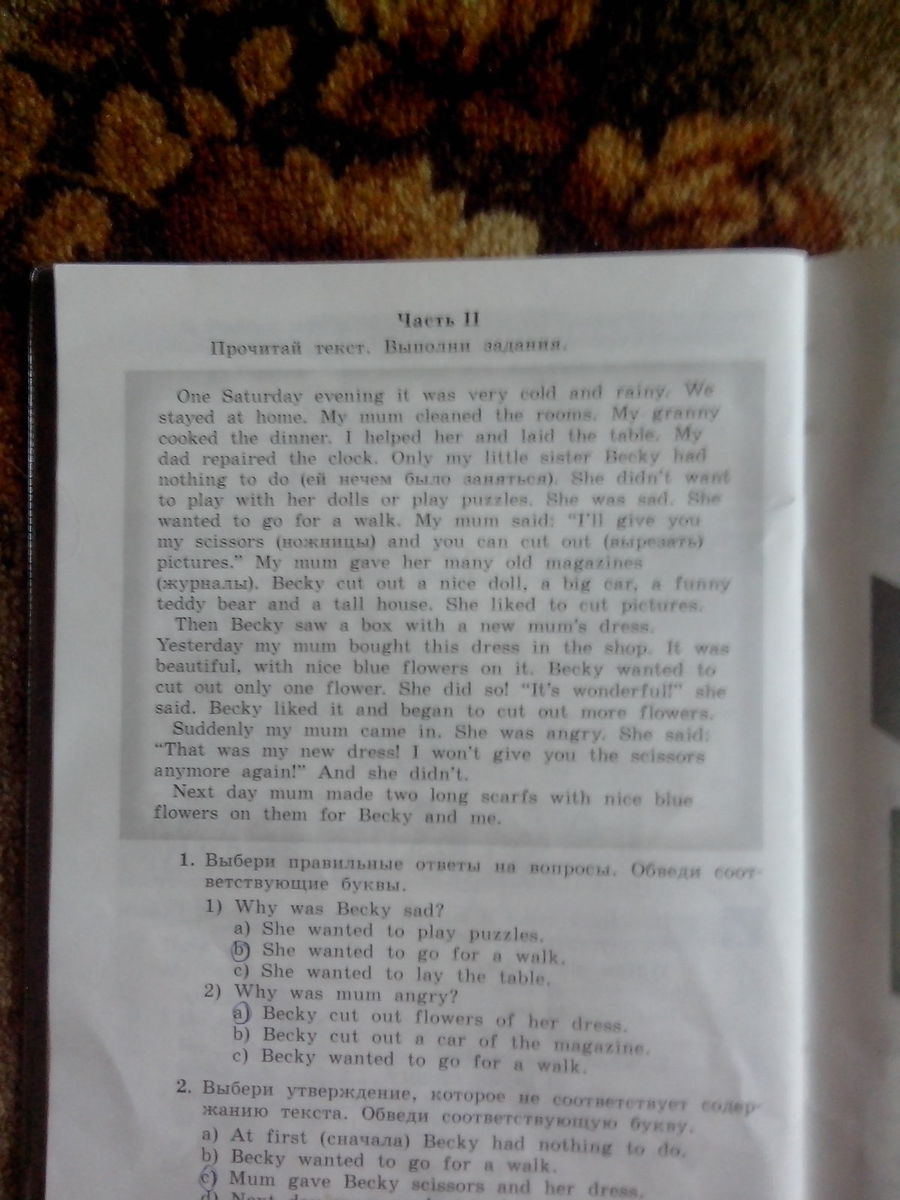 "это замечательно!"-сказала она. Беки это понравилось и она начала вырезать много цветов. Внезапно пришла моя мама. Она рассердилась. Она сказала: "Это было моим новым платьем! Я не буду тебе больше давать ножницы!" И она не сделала.