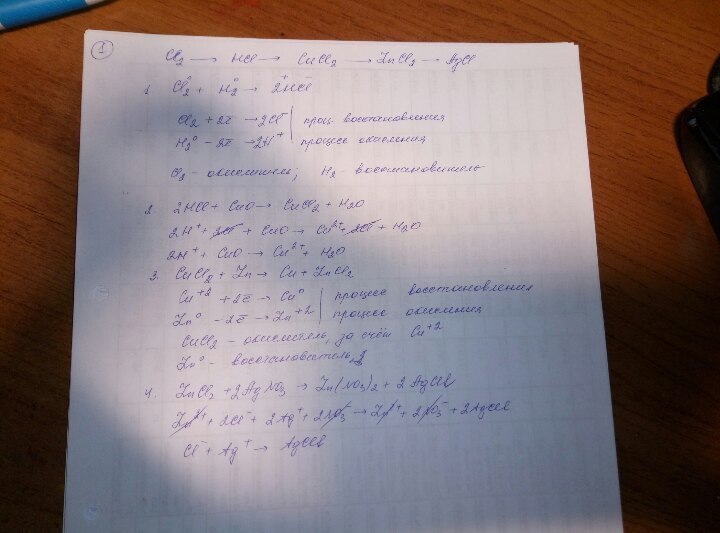 Cl2--->HCl--->CuCl2--->ZnCl2--->AgCl Укажите окислительно-восстановительные реакции и разберите их. Уравнения реакций с участием электролитов запишите в ионной форм