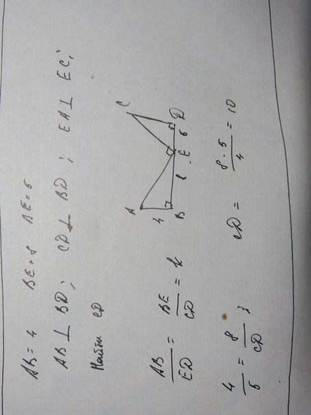 AB=4, BE=8, DE=5, ABперпендикулярноBD, CDперпендикулярноBD,EAперпендикулярноEC. Найдите CD.(Решение с объяснениями!!)