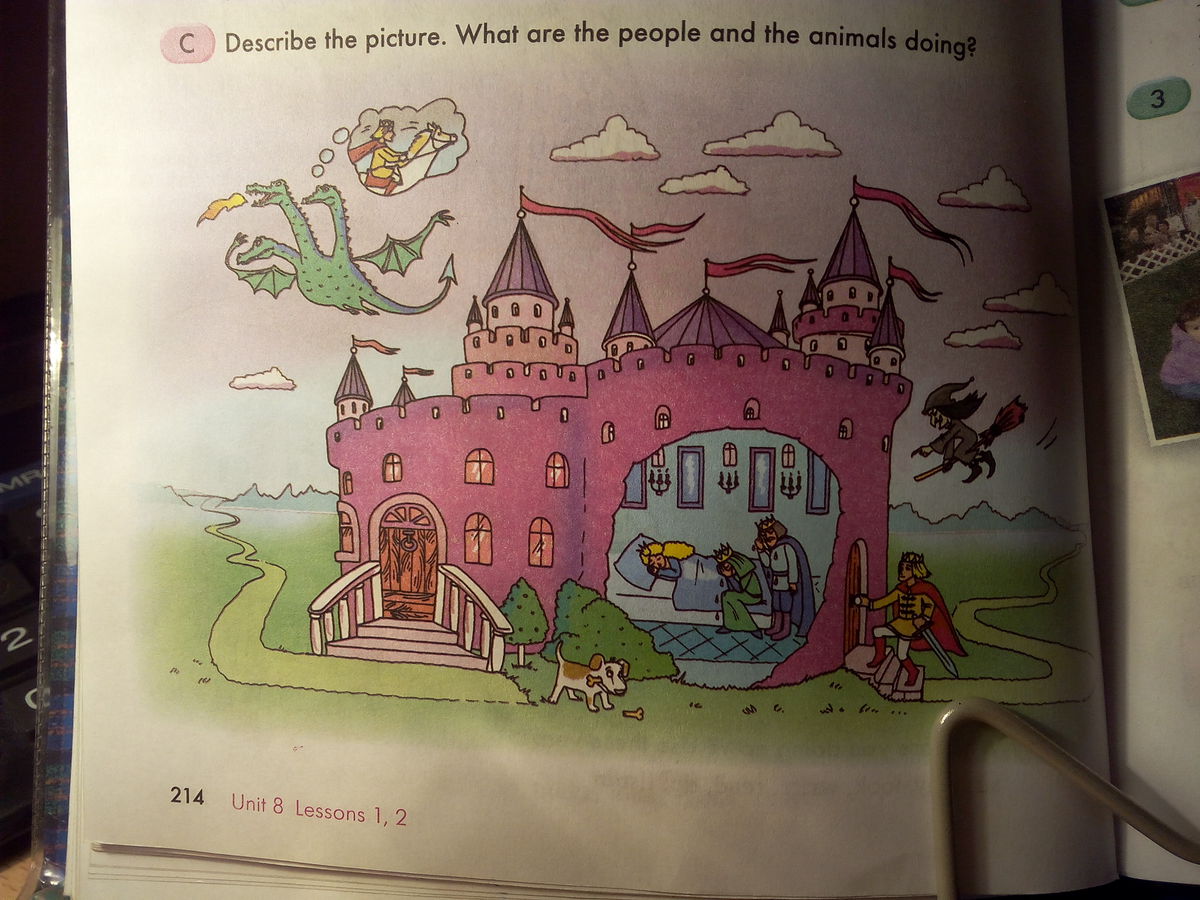 The king and queen are crying because their daughter was ill. Dog playing in the yard. Past the palace and the dragon flew witch.