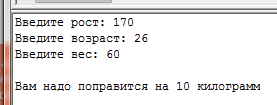 Написать программу для определения веса человека. Запросить рост в см, возраст и его вес. рассчитать норму веса по формуле: