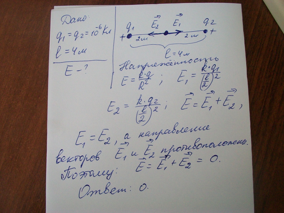 Два одинаковых металлических шарика, имеющие заряды по 10^-6 Кл каждый, находятся на расстоянии 4 м друг от друга. Найдите напряженность электрического поля в точке, находящейся посередине между этими зарядами.