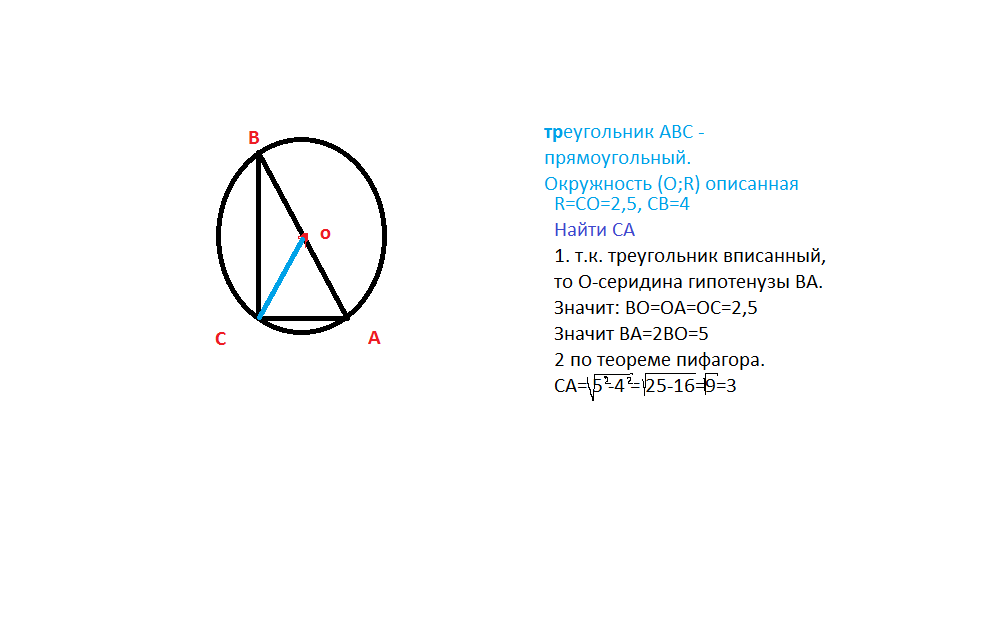 В треугольнике АВС ВС = 4, угол С равен 90 градусов. Радиус описанной окружности этого треугольника равен 2,5.Найдите АС.