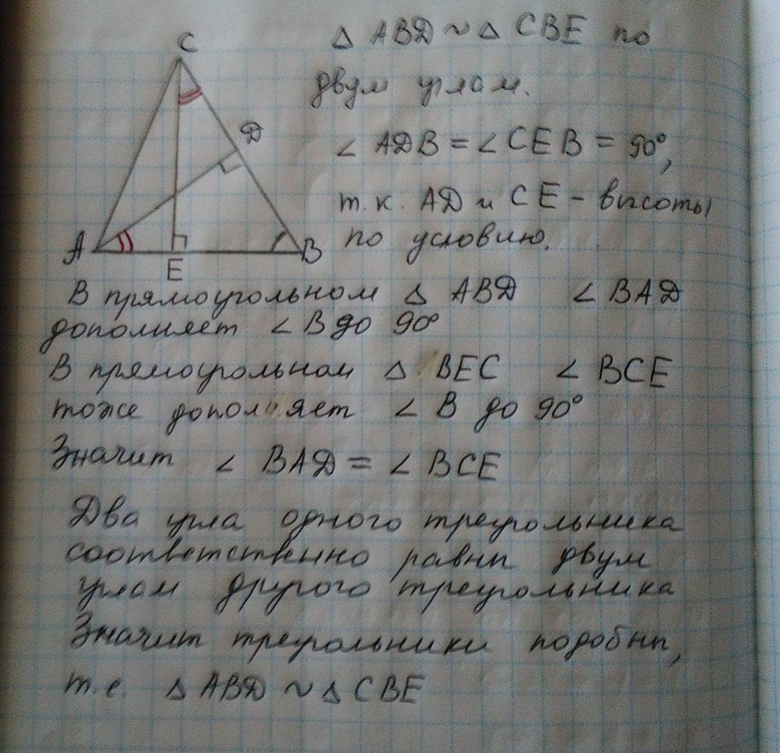 Следовательно треугольники ABD и CBE подобны по 1 признаку, т. е. по двум углам