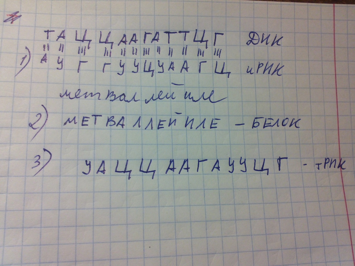 . Фрагмент цепи ДНК имеет следующую последовательность нуклеотидов: ТАЦЦААГАТТЦГ. Определите последовательность нуклеотидов на и-РНК, антикодоны соответствующих т-РНК и аминокислотную последовательность соответствующего фрагмента молекулы белка, используя таблицу генетического кода. (3 элемента ответа)