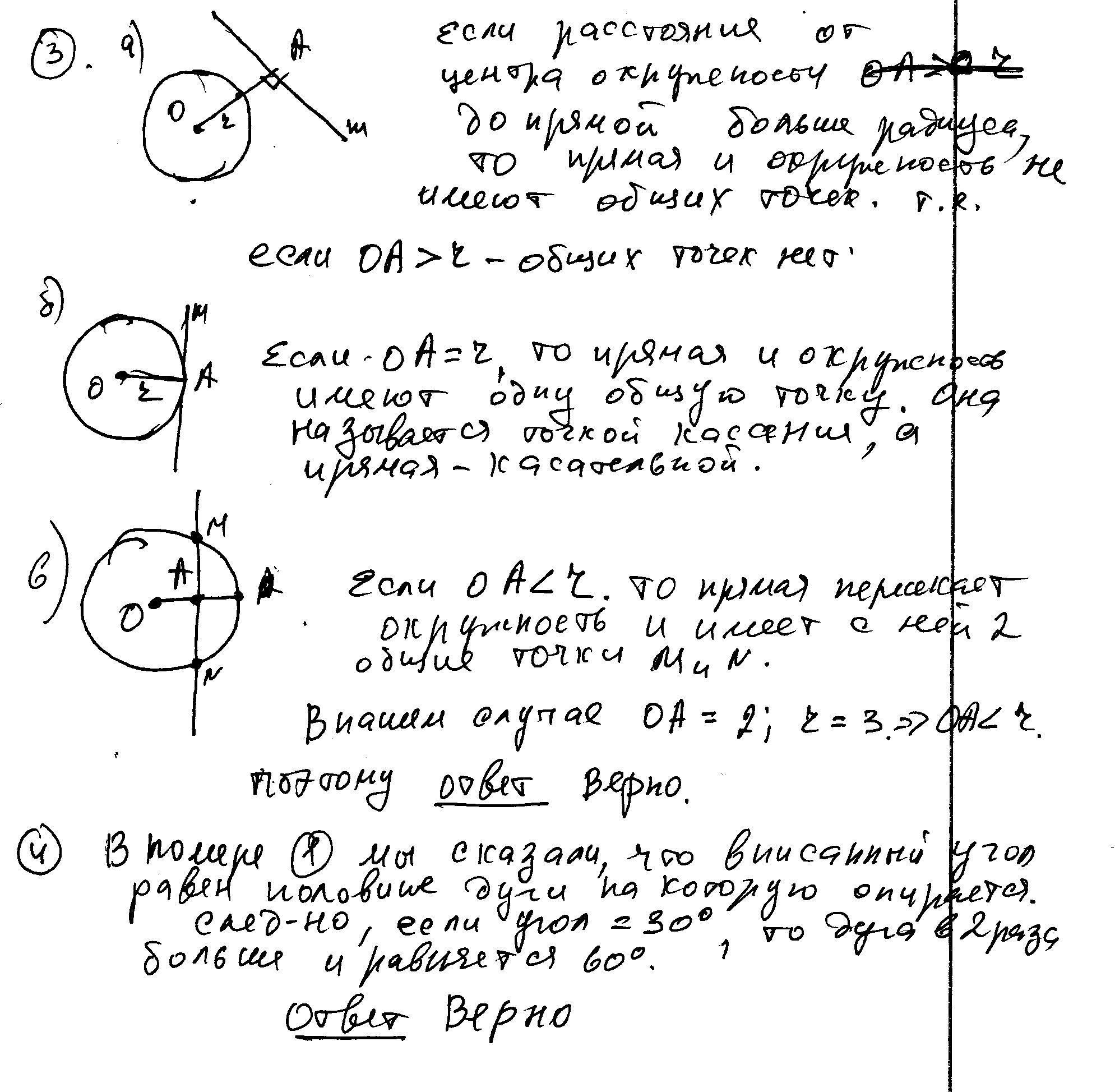 3) Если радиус окружности равен 3, а расстояние от центра окружности до прямой равно 2, то эти прямая и окружность пересекаются.