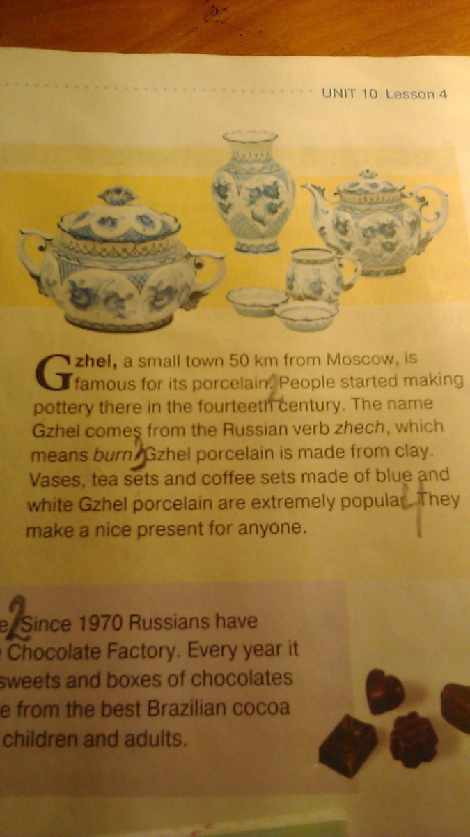 Гжел, небольшой городок в 50 км от Москвы, славится своим фарфором. Люди начали делать название керамику там в fourteetfrcentury. Гжель происходит от русского глагола zhech что означает сжечь Гжель фарфор из глины. вазы, чайные сервизы и кофейные сервизы из синего и белого фарфора Гжель чрезвычайно популярные Они делают хороший подарок для тех, кто.