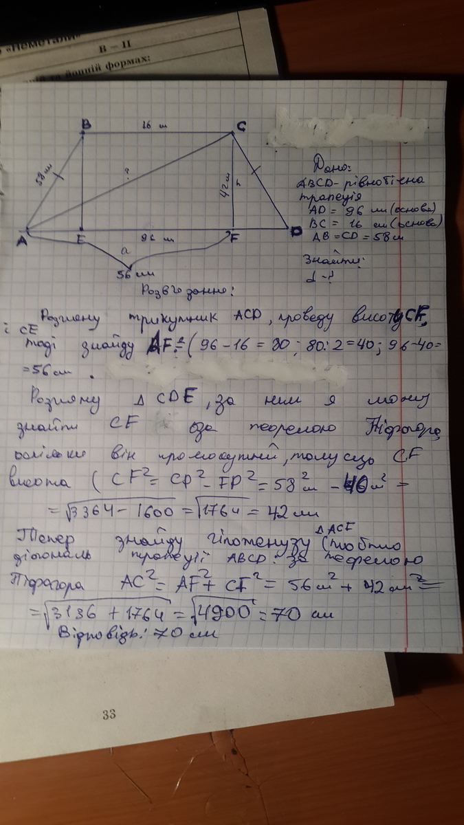 Основания равнобедренной трапеции ABCD равны 16 и 96, боковая сторона AB равна 58. Найдите длину диагонали трапеции идущей из А до С. Как можно подробнее распишите, буду благодарен!