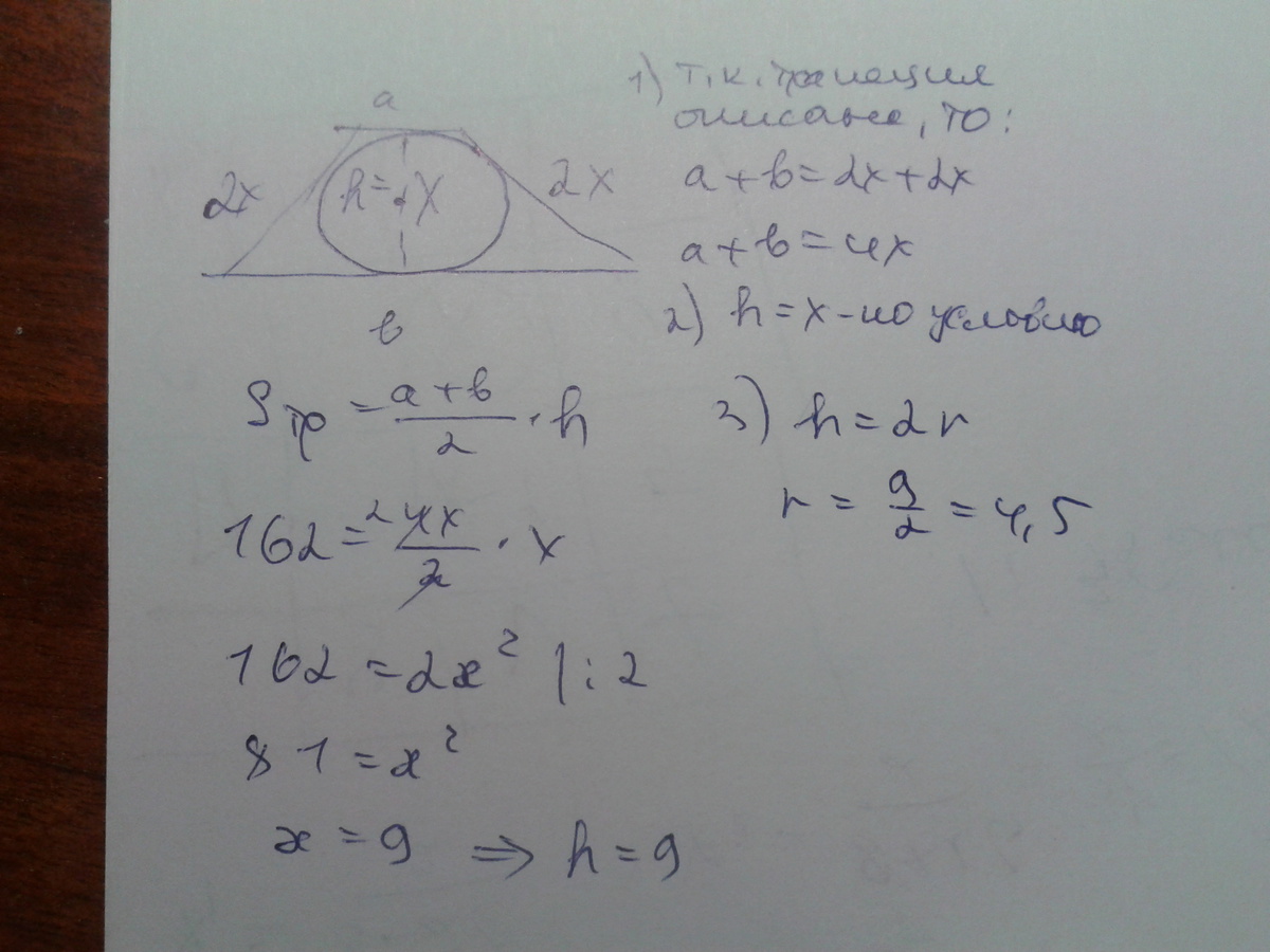 В равнобедренной трапеции высота вдвое меньше её боковой стороны.Площадь составляет 162см в квадраты.найти радиус вписанной окружности реши плиз!!!!!!!!!!!!!!!!!!