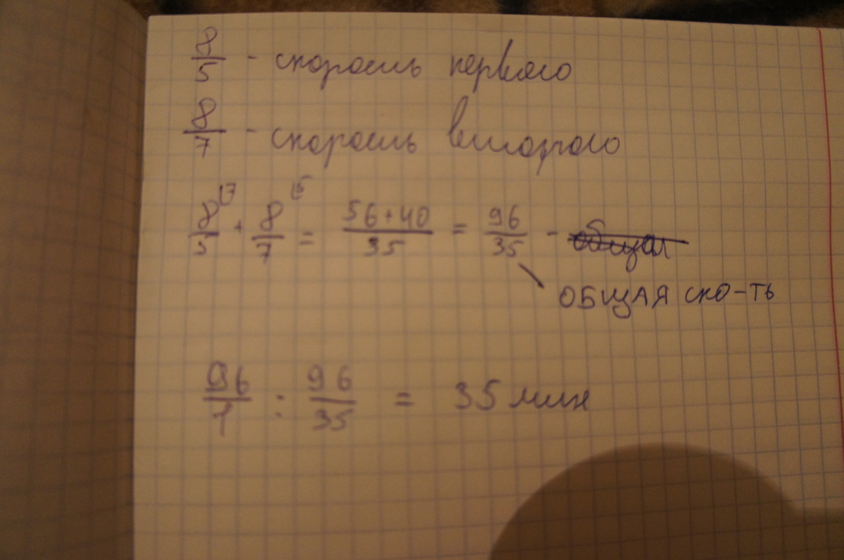 В помощь садовому насосу, перекачивающему 8 литров воды за 5 минут, подключили второй насос, перекачивающий тот же объем за 7 минут. Сколько минут эти два насоса должны работать совместно, чтобы перекачать 96 литров воды?