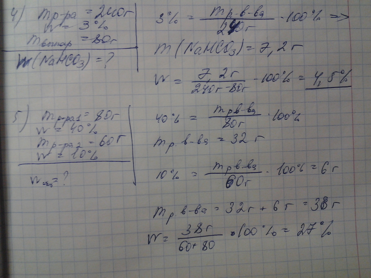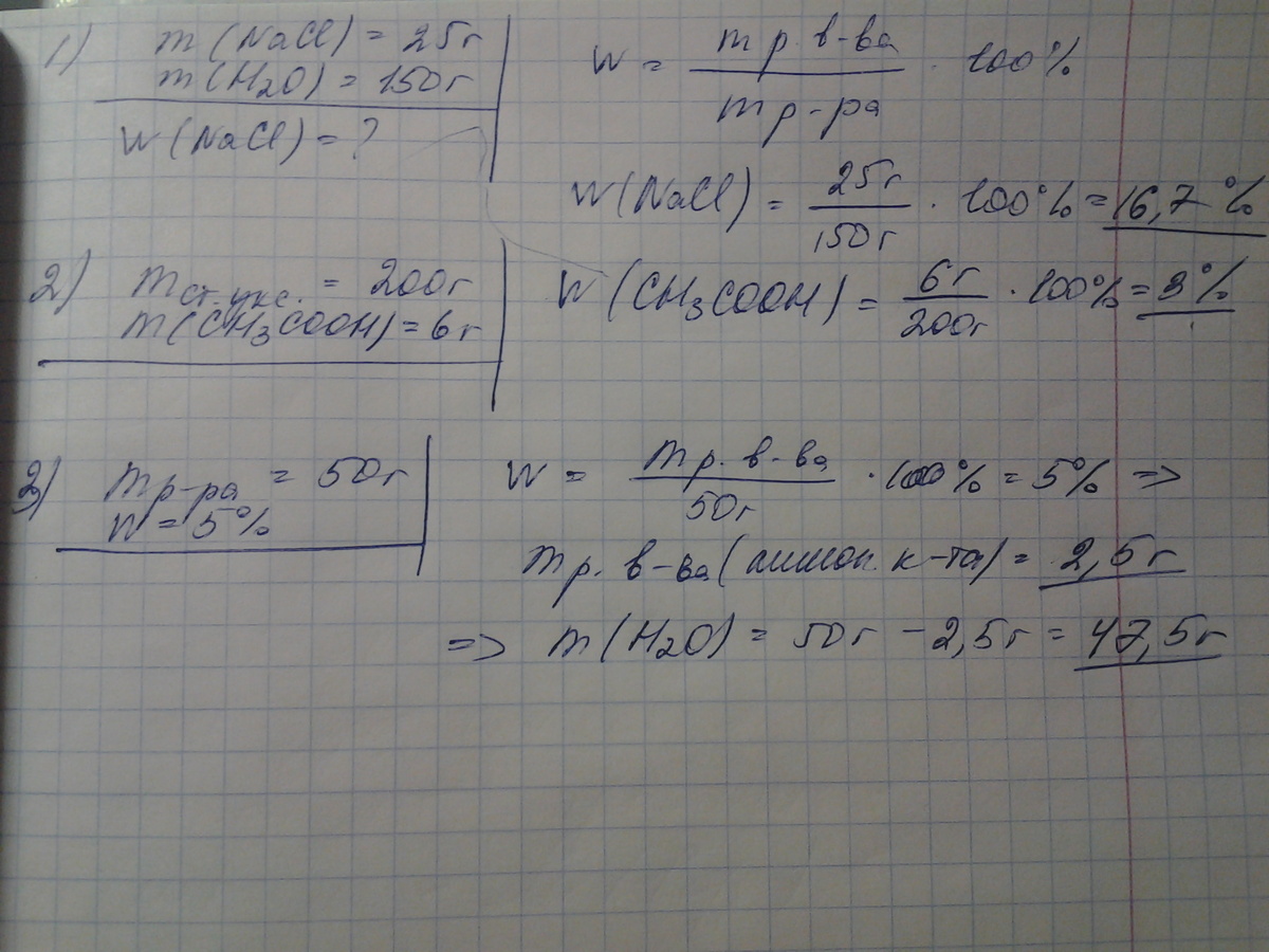 )В 150г воды растворили 25г поваренной соли.Определите массовую долю соли в полученном растворе. 2) В 200г столового уксуса содержится 6г уксусной кислоты. Определите массовую долю кислоты в столовом уксусе. 3)Найдите массу воды и лимонной кислоты, необходимых для приготовления 50г 5% раствора. 4) из 240г 3% раствора питьевой соды выпарили 80г воды.Найдите массовую долю соды в полученном растворе. 5)Смешаем два раствора серной кислоты : 80г 40% и 60г 10% раствора.Найдите массовую долю кислоты в полученном растворе