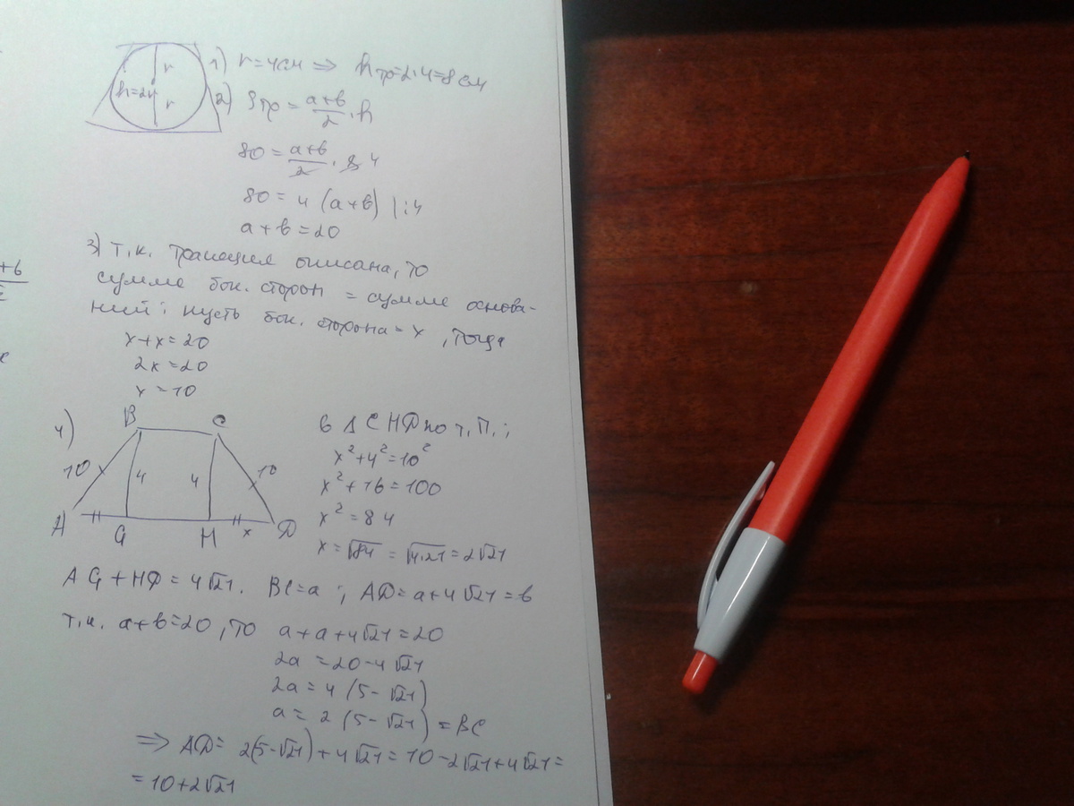 около окружности радиуса 4см описана равнобедренная трапеция площадь 80см^2 найдите стороны трапеции